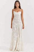 Het lijfje heeft een gebogen zoom die onder de natuurlijke taillelijn valt en de rok glijdt over de heupen en valt vrij naar een zwevende afwerking.