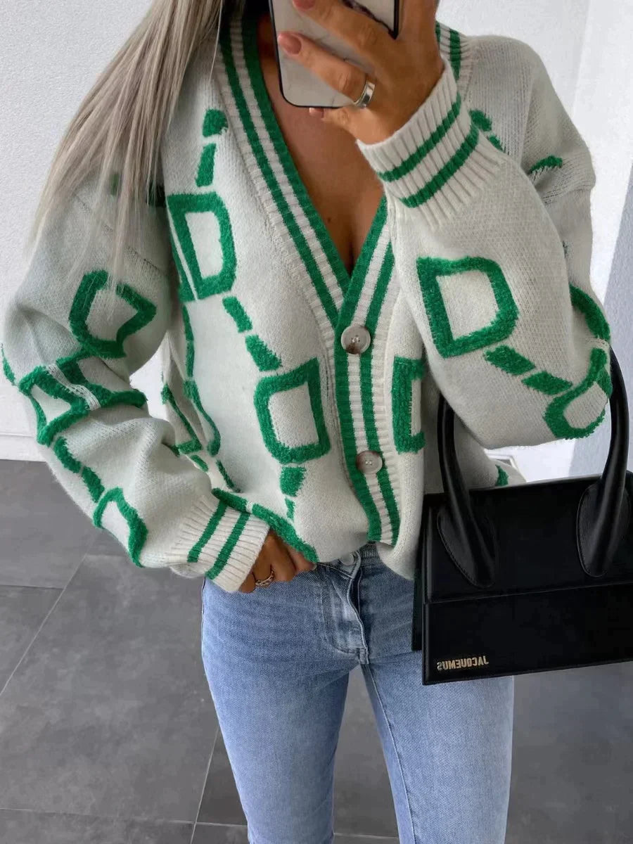 Gebreid Design en Casual Print: Het gebreide ontwerp van deze cardigan biedt niet alleen ultiem comfort, maar voegt ook een vleugje textuur toe aan je look. De casual print in een prachtig groen tintje geeft een speelse en eigentijdse uitstraling aan deze veelzijdige cardigan.