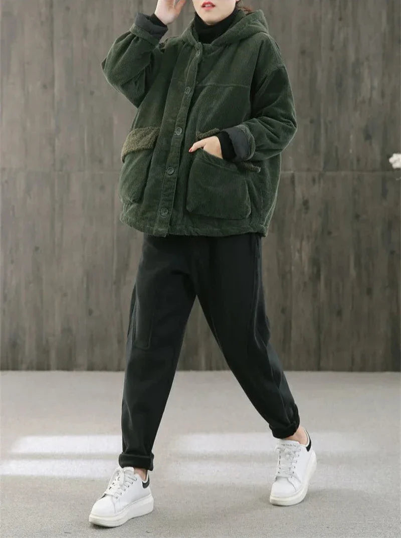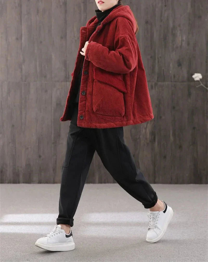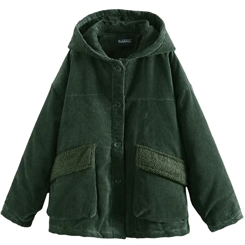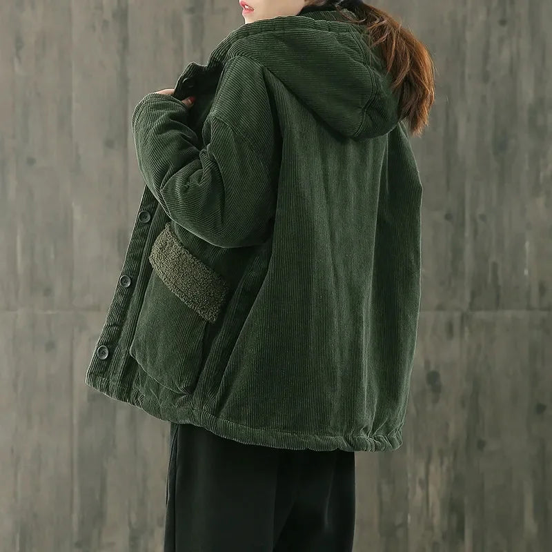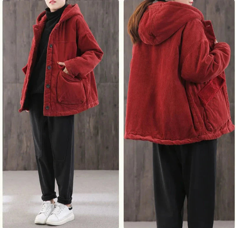 De gewatteerde corduroy jas met capuchon voor dames is de perfecte combinatie van warmte, stijl en functionaliteit