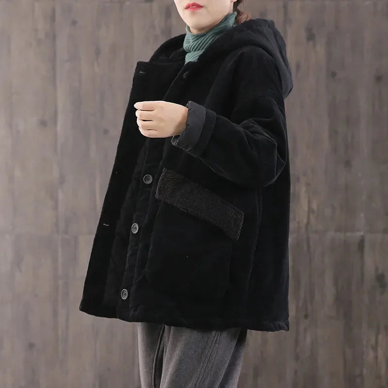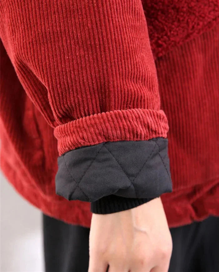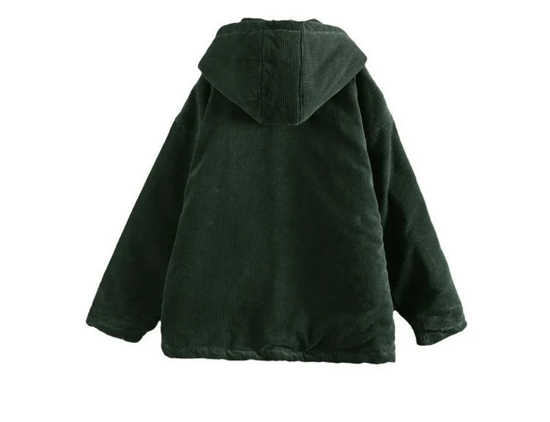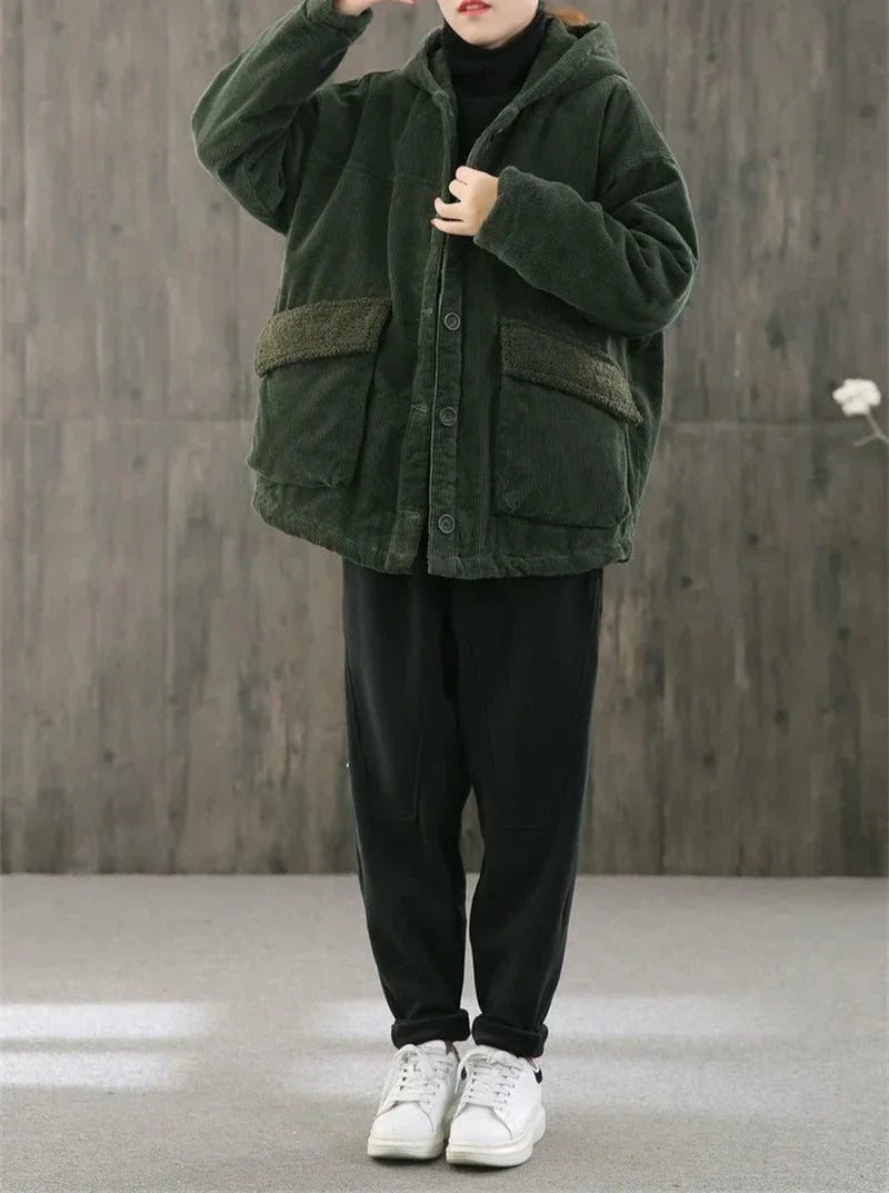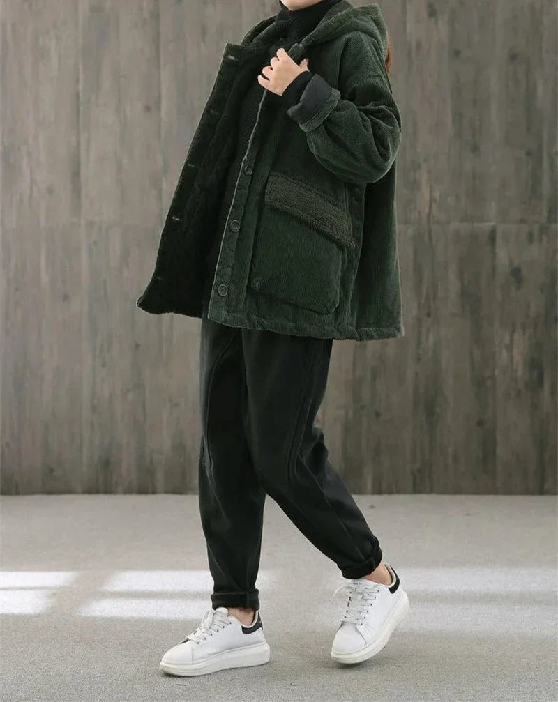 De gewatteerde corduroy jas met capuchon voor dames is de perfecte combinatie van warmte, stijl en functionaliteit