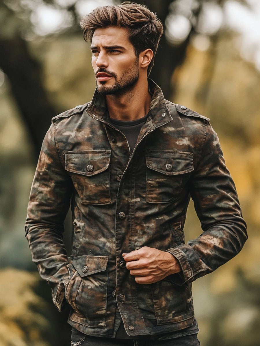Maak kennis met onze Heren Vintage Camouflage Print Multi-Pocket Zipper Casual Jacket, een tijdloos stuk dat vintage stijl naadloos mengt met moderne verfijning