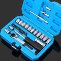 - 29 Delige Set: Bevat een volledige reeks van ratels en dopsleutels in verschillende maten, zodat je altijd de juiste tool binnen handbereik hebt.