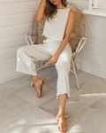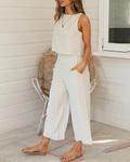 - Design: De set bestaat uit een losse, elegante top en een bijpassende broek. Het ontwerp is eenvoudig maar stijlvol, ideaal voor een casual look die toch verfijnd is.