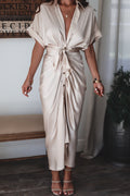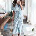 Geniet van het toppunt van elegantie met onze Nubil Classy Dress. Deze prachtige creatie heeft prachtige draperieën en ruches op de rok, die moeiteloos uw rondingen accentueren. De v-hals voegt allure toe en omlijst het decolleté met verfijning. Omarm tijdloze schoonheid en laat hoofden omdraaien waar je ook gaat met de fascinerende elegantie van onze enkellange gedrapeerde jurk met V-hals.