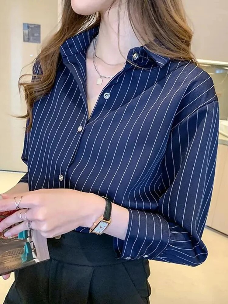 Dit overhemd is gemaakt met veel aandacht voor detail en straalt verfijning en stijl uit. Het klassieke gestreepte ontwerp, gecombineerd met een enkele knoopsluiting aan de voorkant en een omgeslagen kraag, maakt het een veelzijdig kledingstuk dat geschikt is voor zowel kantoor als vrije tijd. De lange mouwen en V-halslijn voegen een vleugje verfijning toe, terwijl de effen kleuren ervoor zorgen dat je het moeiteloos kunt combineren met je favoriete broek.