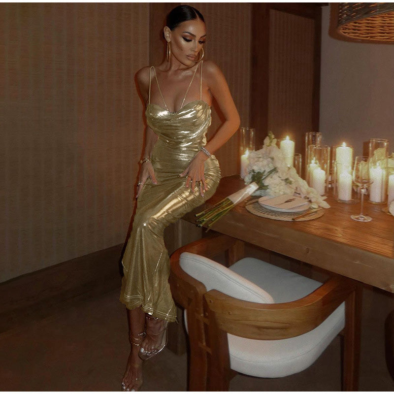 Dit is een echte blikvanger! Deze leuke jurk heeft dunne (dubbele) schouderbandjes, een watervalhals en een strakke pasvorm. Het materiaal is rekbaar en goudkleurig. Draag de jurk met hakken en je outfit is compleet.
