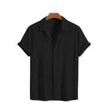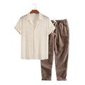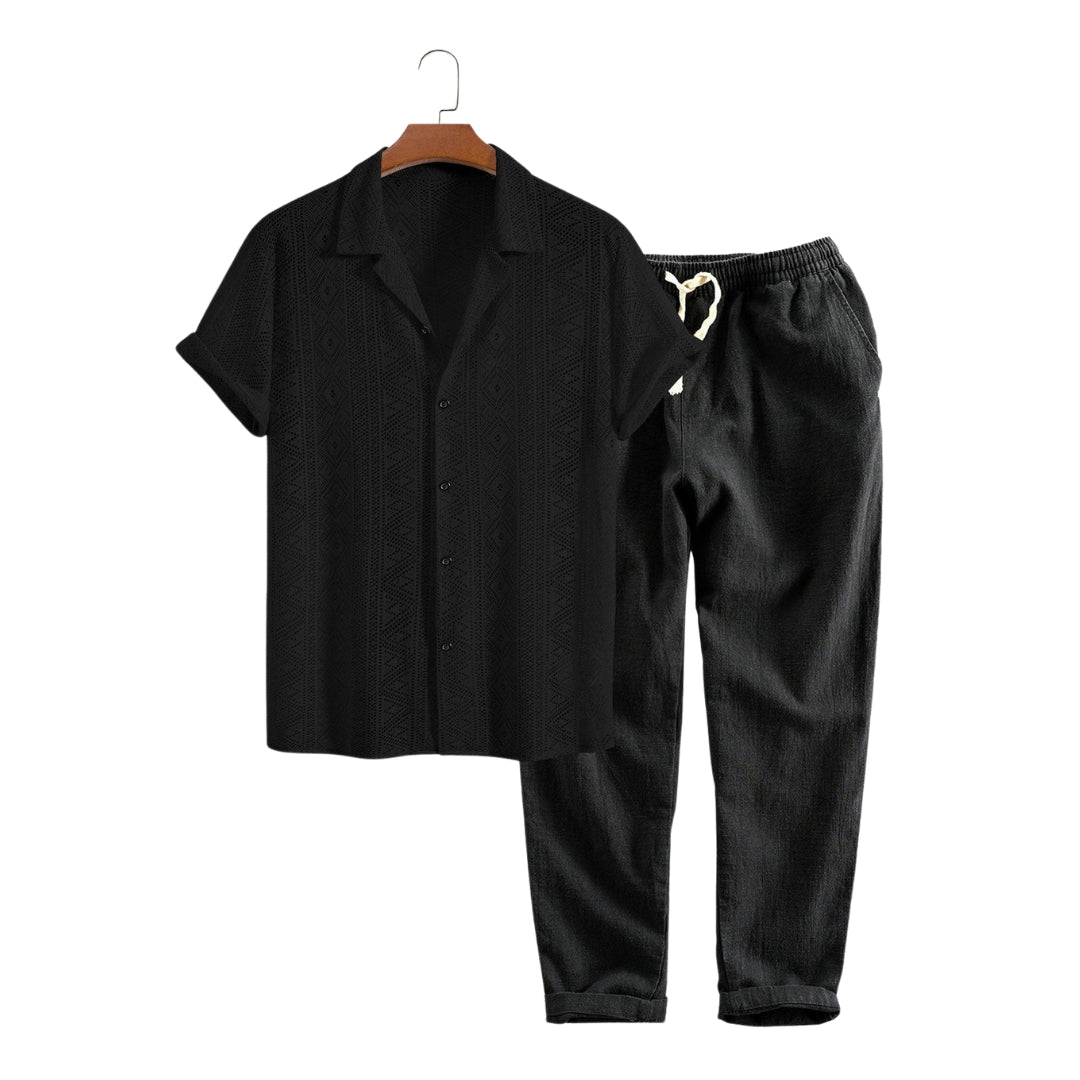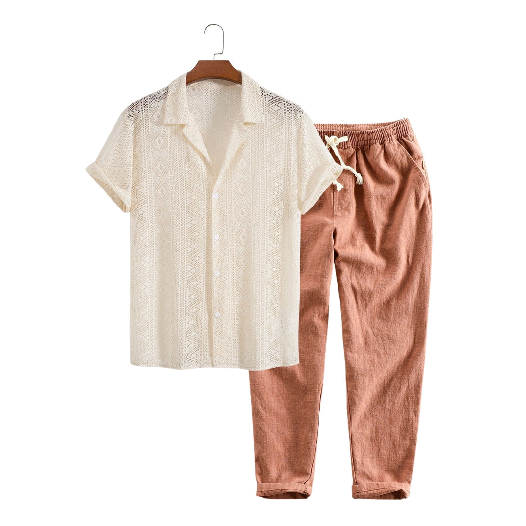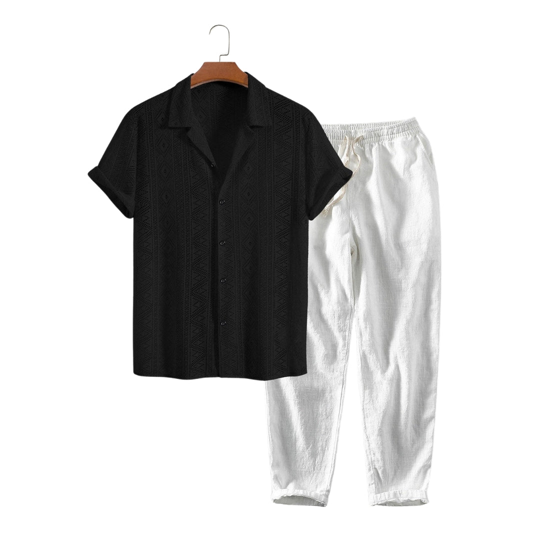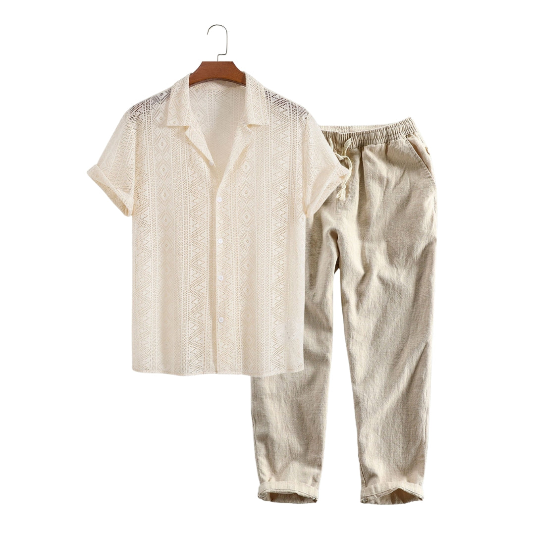 Verhef je zomerse stijl met onze Nubil Heren Korte Mouwen Geometrisch Gestructureerd Cubaans Overhemd en Linnen-Katoenen Cropped Broek.