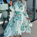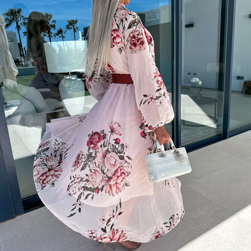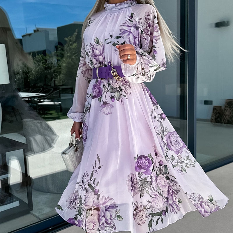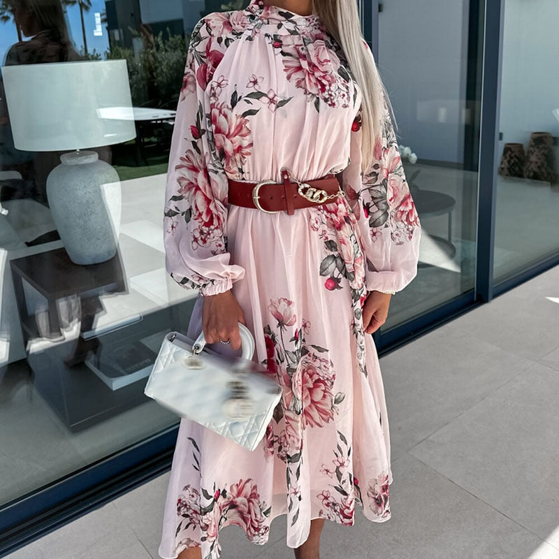 Bloemen! Deze schattige midi-jurk heeft een zomerse bloemenprint, een bijpassende ceintuur en een geweldige pasvorm. De jurk heeft lange mouwen, een hoge ronde hals en een elastische taille. Draag deze jurk met hakken of sandalen en je outfit is compleet.