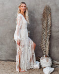 Wij houden van kant! Deze mooie kanten jurk heeft lange mouwen, een diepe V-hals en een split. De jurk heeft een onderjurk die halverwege de benen en bij de schouders eindigt. Dit zorgt voor een mooi doorschijnend effect. Draag deze jurk met hakken of sandalen en je outfit is compleet.