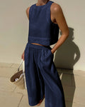 Deze set, bestaande uit een mouwloze crop top en een wijde broek, is perfect voor elke vrouw die op zoek is naar een look die zowel ontspannen als chique is.
