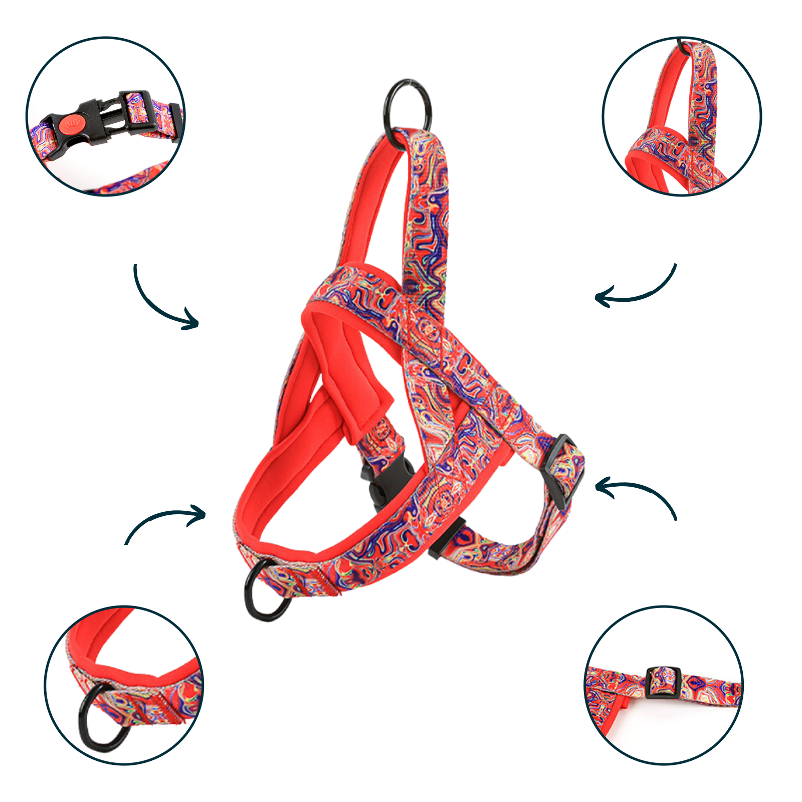 Ons tuigje is ontworpen met zorg en precisie, met een uniek mechanisme aan de voorkant dat zachtjes herleidt wanneer je hond probeert te trekken, waardoor het wandelen soepel en stressvrij wordt.