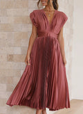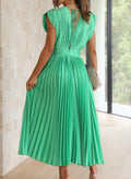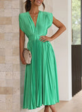 De korte mouwen bieden praktische bedekking, terwijl de lange, vloeiende snit een gracieuze silhouet creëert dat zachtjes met je mee danst bij elke beweging. De levendige groene tint is niet alleen trendy, maar ook een symbool van vernieuwing en vitaliteit.