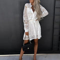 Dit kanten jurkje heeft lange mouwen, een V-hals en een onderjurk. De jurk sluit met knopen en heeft een bijpassende riem. Het uitlopende ontwerp is comfortabel om te dragen en daarom perfect voor warme dagen.