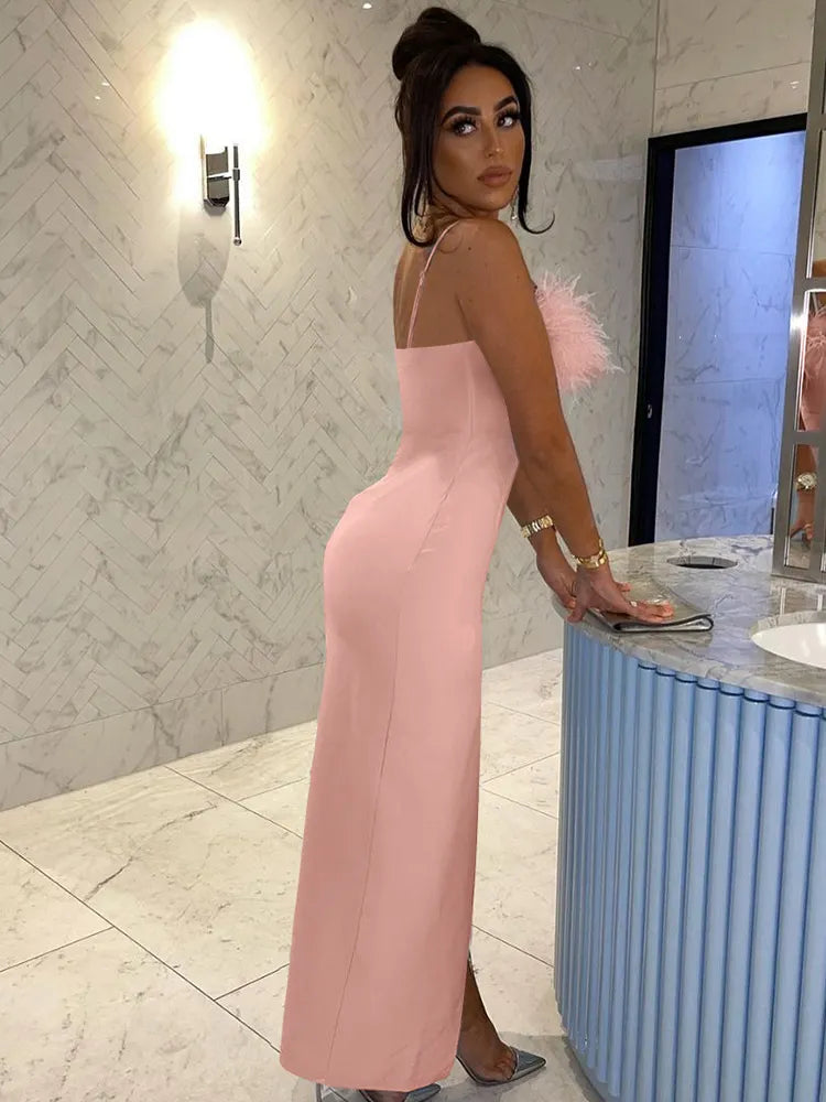 We love feathers! Dit prachtige maxi-jurk heeft dunne schouderbandjes, een split en een rechte halslijn met veren. De pasvorm is strak en het rekbare materiaal zit comfortabel. Draag deze jurk met hakken en je bent klaar!