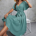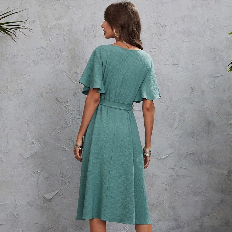 Deze Midi-wikkeljurk heeft een delicate pasvorm en is gemaakt van lichtgewicht materiaal. De jurk heeft een V-hals, uitlopende mouwen en een strik in de taille. De zomerse kleur is helemaal in en geeft een chique uitstraling. Maak je outfit compleet met sandalen.