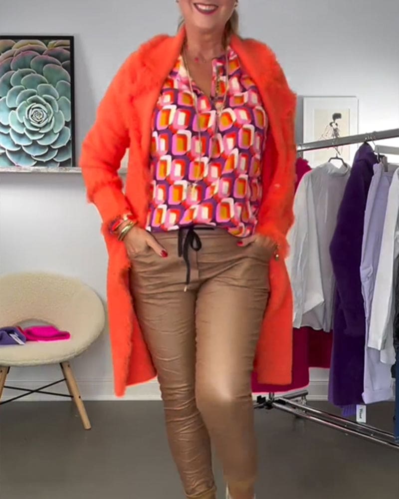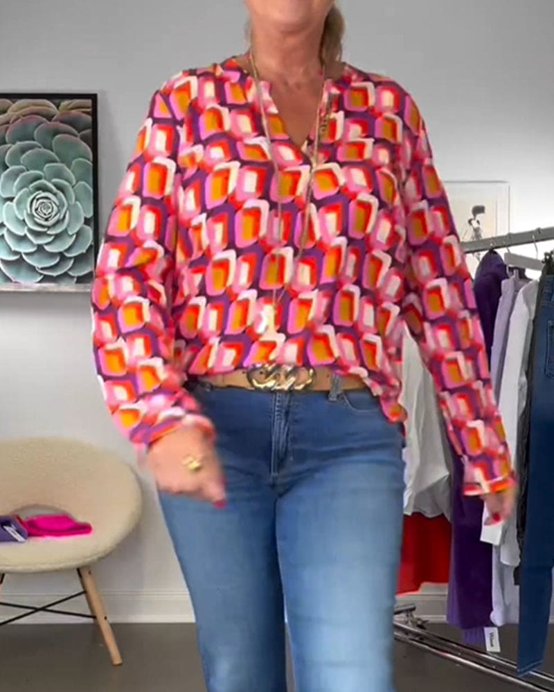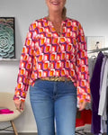 Opvallend visueel aantrekkelijk: De felle contrasterende kleuren en geometrische patronen maken van deze blouse een opvallend stuk.