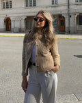 Ontdek tijdloze elegantie met ons beige slim-fit jack. Perfecte pasvorm met normale mouwen, monochroom patroon, O-kraag en elegante zakken. Gemaakt van dik materiaal en in een normale lengte, ideaal als bovenkleding. Combineer met jeans voor casual chic of over een jurk voor een elegante look.
