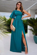 Opvallende eyecatcher! Deze fantastische jurk is stijlvol en sexy. De one-shoulder jurk heeft een korte mouw, een split en is maxi-lengte. De jurk is licht geplooid door de tailleband. Draag deze jurk met statement oorbellen en hakken om je outfit compleet te maken.