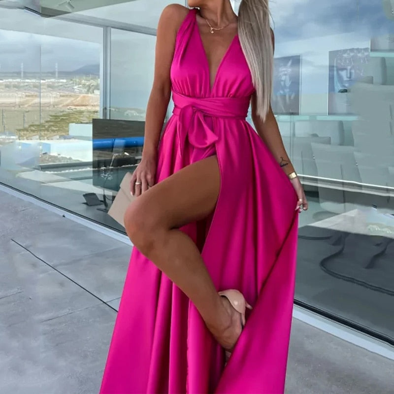 Deze mooie maxijurk heeft een diepe V-hals, een tailleband, een hoge split en gekruiste bandjes aan de achterkant. Het materiaal is licht glanzend en de pasvorm is soepel.