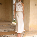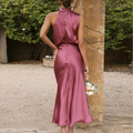 Wauw! Deze prachtige jurk heeft één bedekte schouder, een hoge halslijn en een elastische taille. Het soepele satijnen materiaal is licht glanzend en drapeert prachtig over het lichaam.