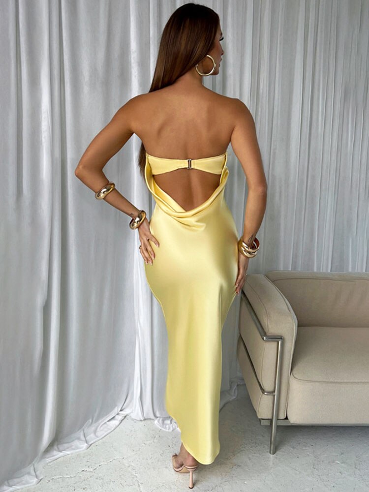 Dit strapless jurkje is alles wat je nodig hebt! Het satijnmateriaal maakt deze jurk chic maar ook sexy. De jurk heeft een blote rug en een goede pasvorm. Het licht glanzende materiaal valt zachtjes over het lichaam en draagt comfortabel. Draag dit jurkje met hakken en je outfit is compleet.