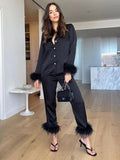 Slaap in stijl! Dit schattige setje heeft veren aan de uiteinden van de mouwen en de broek. Met zijn satijnen materiaal, V-hals en knoopjes kan dit setje ook gedragen worden voor een avondje uit. Draag het pakje met hakken en een handtas of trek het setje aan voor een lekker avondje in bed.