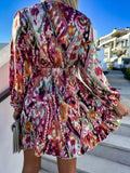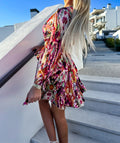 Dit schattige jurkje heeft lange mouwen, een V-hals, een ruches overslag en een bijpassende riem. De jurk heeft een zomerse print en draagt erg comfortabel vanwege de soepele pasvorm. Draag de jurk met hakken of instappers en je outfit is compleet!